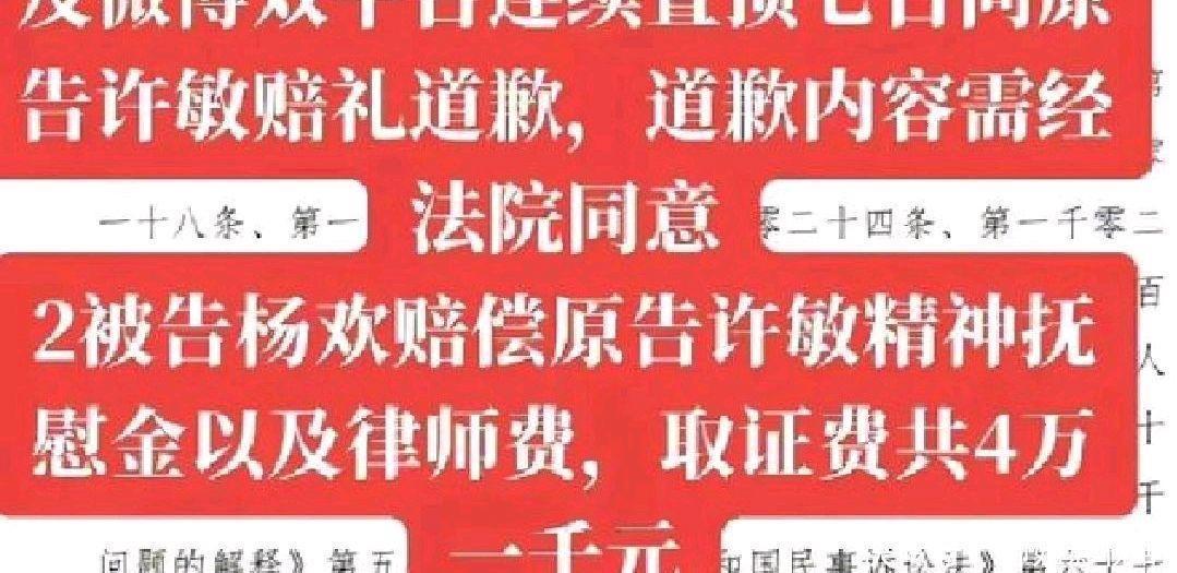 临了的后果是欢欢输了,加起来要补偿4万1。楷模告了5个东谈主,加起来也就4万多吧。还那么慷慨肠晒判决,是以楷模赢了即是赢了,许敏赢了还不是赢?